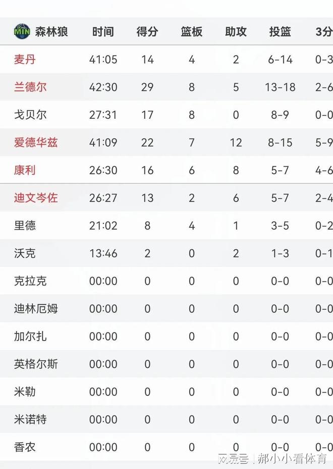 其实勇士第一节打得可圈可点,起码没有让森林狼首节就打崩,库明加、波杰姆斯基、希尔德发挥尚可。第一节结束,勇士客场23:30落后森林狼。但第二节就不一样了,勇士一度追到38:41仅差森林狼三分。但后面森林狼一波流拉开分差,再不给勇士机会。半场结束,勇士47:52落后森林狼15分。第三节还剩7分2秒,库明加制造戈贝尔犯规两罚中一,勇士57:74森林狼。三节结束,勇士72:93落后森林狼21分。第四节还剩8分50秒,波杰姆斯基单打康利高难度打板球进,勇士追到85:97,森林狼暂停。第四节还剩6分36秒,麦丹抢断一条龙暴扣得分,森林狼104:90打停勇士。
